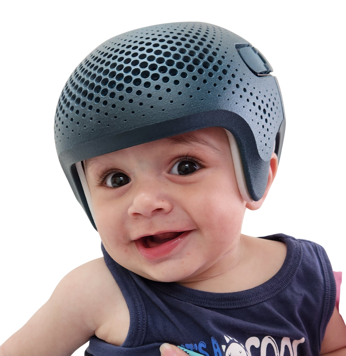 The newest 3D-printed cranial helmet. It features a large opening at the top of the head and perforated foam lining to promote improved airflow and ventilation. The wide opening and self-closing latch system make it easy for parents to put on and remove, while still providing a secure fit.